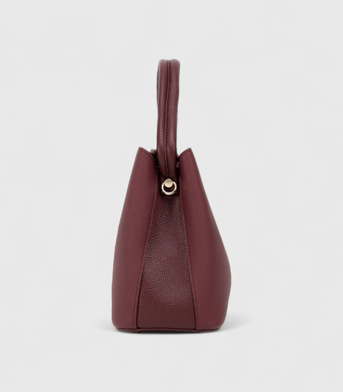 Ova elegantna bordo torba s prepoznatljivom teksturiranom završnom obradom savršen je spoj klasičnog stila i modernog dizajna. Ističe se svojim oblikom i upečatljivom kopčom u kombinaciji kože i zlatnog detalja, koja ne samo da osigurava sadržaj već služi i kao sofisticirani akcent. Zahvaljujući optimalnoj veličini i čvrstim ručkama, idealan je izbor za nošenje svih vaših dnevnih potrepština, bilo da idete na posao ili na večernji izlazak.