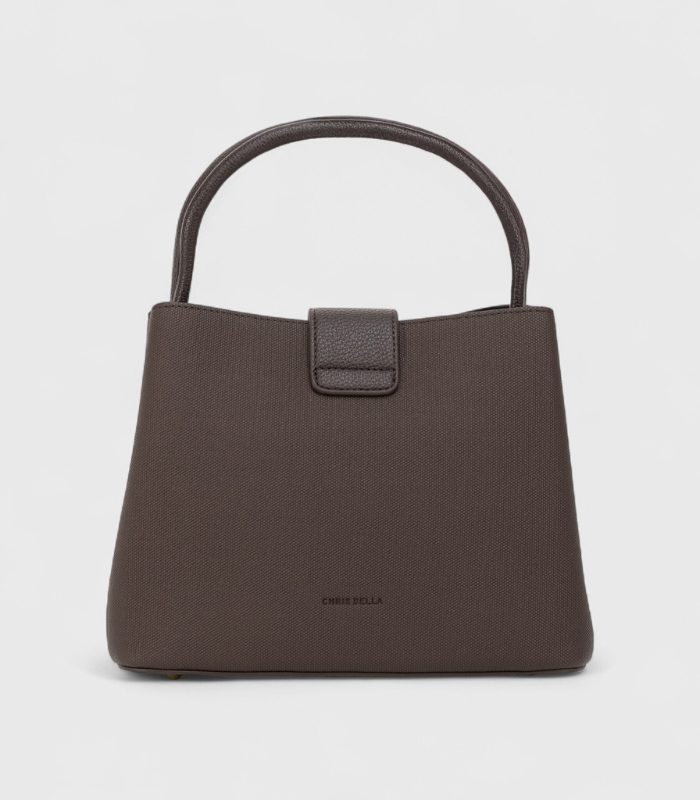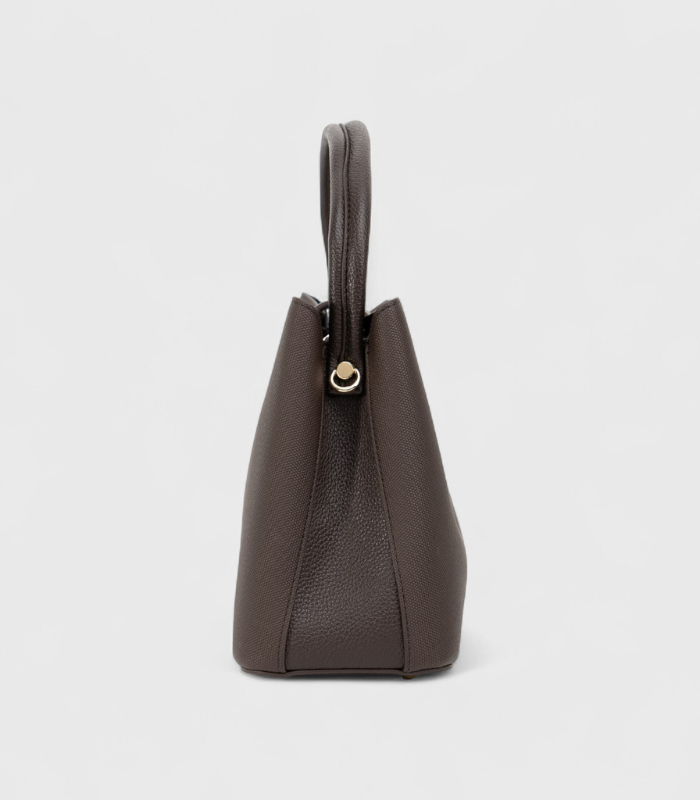 Torba u tamnosmeđoj nijansi koja odiše modernim karakterom i bezvremenskom profinjenošću. Većinski izrađena od kvalitetnog teksturiranog materijala, s pažljivo dodanim detaljima od eko kože, donosi savršen sklad između različitih tekstura. Ističe se prepoznatljivim oblikom i kopčom u kombinaciji kože i zlatnih tonova, koja joj daje dozu luksuza. Zahvaljujući praktičnoj veličini i čvrstim ručkama, idealna je za svakodnevne prilike — od poslovnog dana do večernjeg izlaska.
