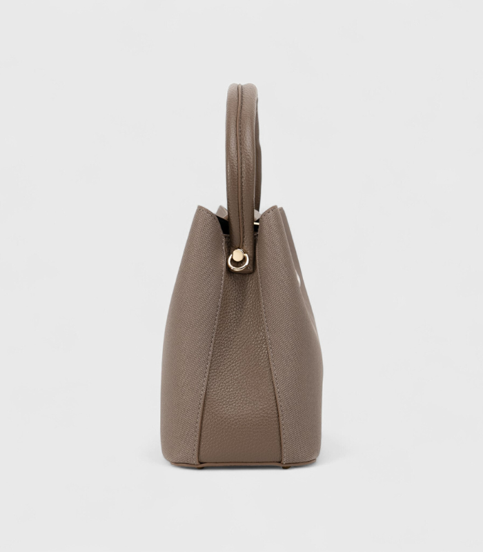 U trendi smeđoj nude nijansi, ova torba donosi savršenu ravnotežu elegancije i savremenog minimalizma. Izrađena od kombinacije teksturiranog materijala i detalja od eko kože, odiše profinjenošću i lako se uklapa uz različite stilove. Zlatna kopča s kožnim akcentom dodaje notu luksuza, dok njena praktična veličina i čvrste ručke osiguravaju udobnost i funkcionalnost u svakodnevnom nošenju.