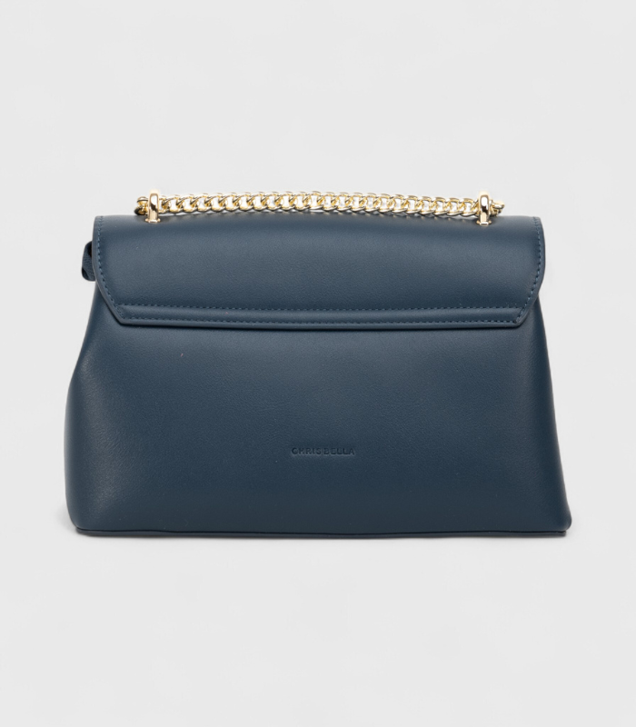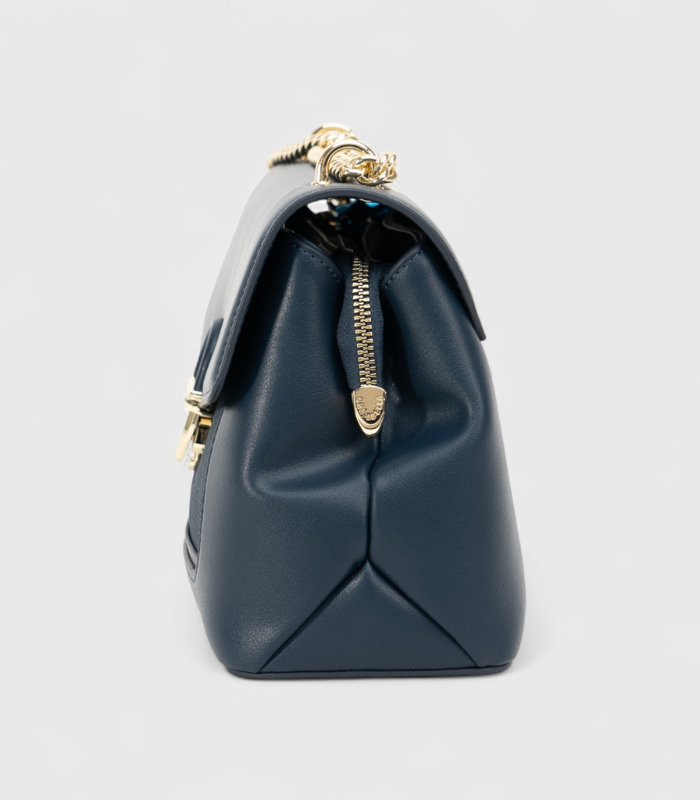 Ova strukturirana torbica u klasičnoj, dubokoj “navy” plavoj boji predstavlja savršen spoj bezvremenosti i modernih detalja. Njen dizajn obogaćen je jedinstvenim teksturiranim panelom i luksuznom zlatnom kopčom, dajući joj izuzetnu vizualnu dinamiku. Zlatni kaiš, kombiniran s lancem, pruža glamurozni završni dodir, čineći je idealnom za formalne prilike i elegantne izlaske.