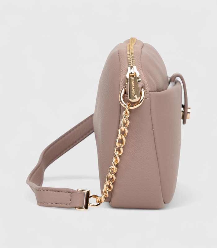 Ova elegantna crossbody torbica u neutralnoj prljavo roze (taupe) boji savršen je spoj šika i praktičnosti. Izrađena od visokokvalitetne ekološke kože, krasi je kompaktni dizajn sa zlatnim detaljima, uključujući ukrasni lanac i funkcionalni prednji džep. Torbica je idealna za svakodnevno nošenje ili večernje izlaske, donoseći dašak elegancije svakoj kombinaciji.
