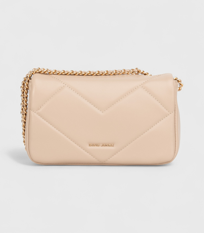 Ova elegantna torbica plijeni pažnju svojom nježnom bež bojom. Njezina mekana prošivena tekstura dodaje dimenziju profinjenosti i privlačnost. Sjajni zlatni lanac služi kao glamurozan kaiš, dok upečatljiva zlatna kopča na preklopu diskretno naglašava pažnju posvećenu detaljima.
