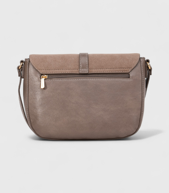 Ova klasična crossbody torba dolazi u izuzetno sofisticiranoj fungi nijansi – savršenom spoju zemljane sive i bež boje koja se s lakoćom uklapa u svaku modnu paletu. Njen zaobljeni preklop ističe se mekanom, brušenom završnom obradom koja pruža ugodan kontrast glatkom tijelu torbe. Elegantna zlatna kopča i podesivi kaiš čine je funkcionalnim i izuzetno chic dodatkom.