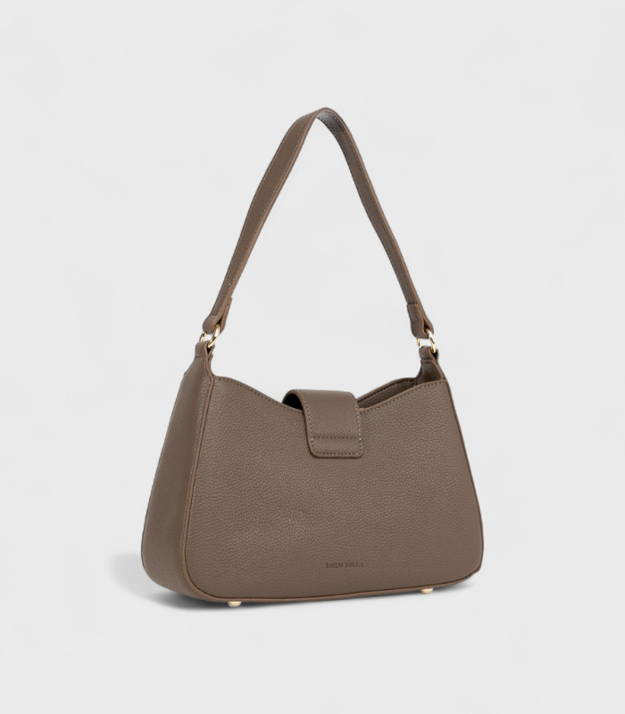 Torbica za rame u sofisticiranoj sivo smeđoj nijansi savršena je za postizanje poliranog i trendi minimalističkog looka. Njen zaobljeni, fluidni oblik i kratka ručka idealni su za udobno nošenje uz tijelo, dok zrnata tekstura materijala odaje dojam visoke kvalitete. Luksuzna zlatna kopča služi kao upečatljiv, ali suptilan akcent. Ovo je izuzetno svestran komad koji se lako kombinira sa svim paletama, čineći ga nezaobilaznim dodatkom u vašoj kolekciji.