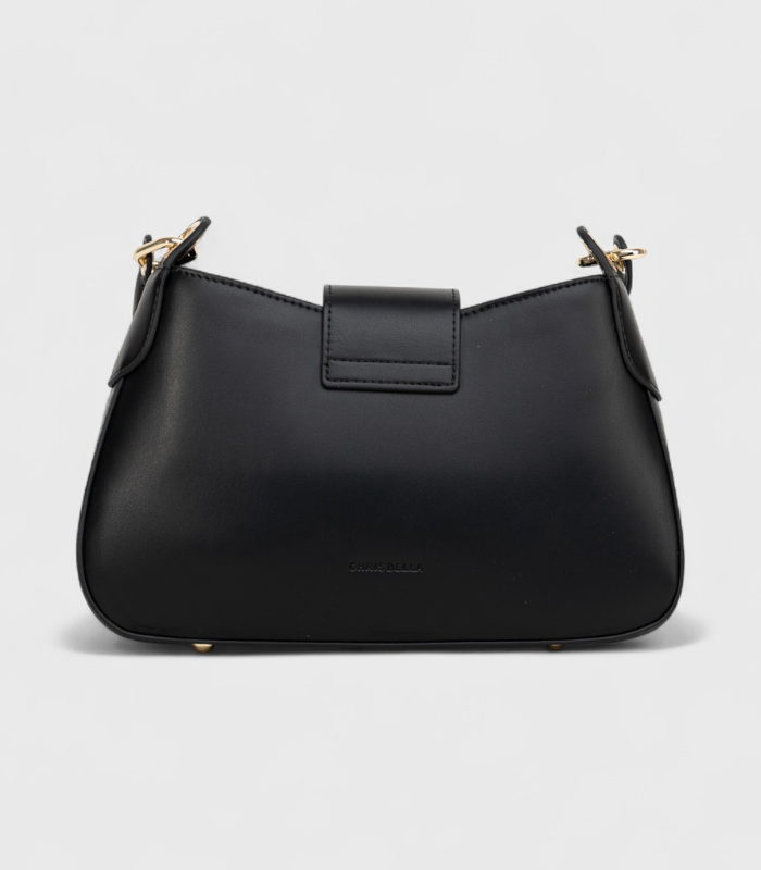 Ova bezvremenska baguette torbica u klasičnoj crnoj boji predstavlja esenciju urbanog stila i elegancije. Crni preklop naglašen je dominantnom zlatnom metalnom kopčom ovalnog oblika, koja stvara upečatljiv fokus. Savršena je za nošenje preko ramena i neizostavan je modni dodatak koji se besprijekorno uklapa u sve, od poslovnog do večernjeg looka.