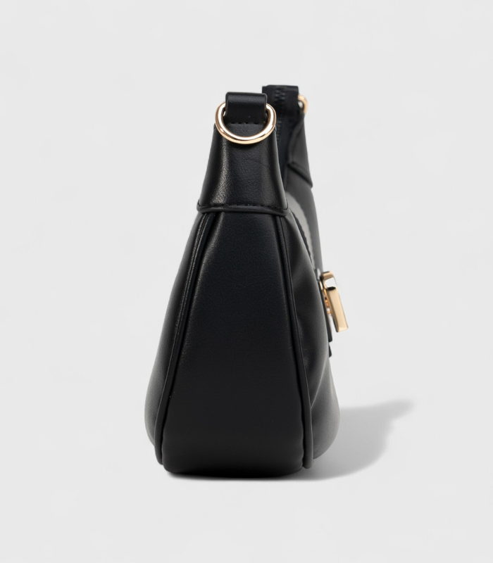 Ova moderna crna torbica savršen je dodatak za svaku priliku, ističući se svojim trendi zaobljenim oblikom. Izrađena od glatke eko-kože, ima kompaktan dizajn, ali nudi dovoljno prostora za vaše osnovne potrepštine. Metalni detalji u zlatnoj boji i prepoznatljiva kopča sa logotipom daju joj sofisticiran i luksuzan izgled. Nosite je preko ramena kao baguette torbu za šik, večernji ili dnevni outfit!