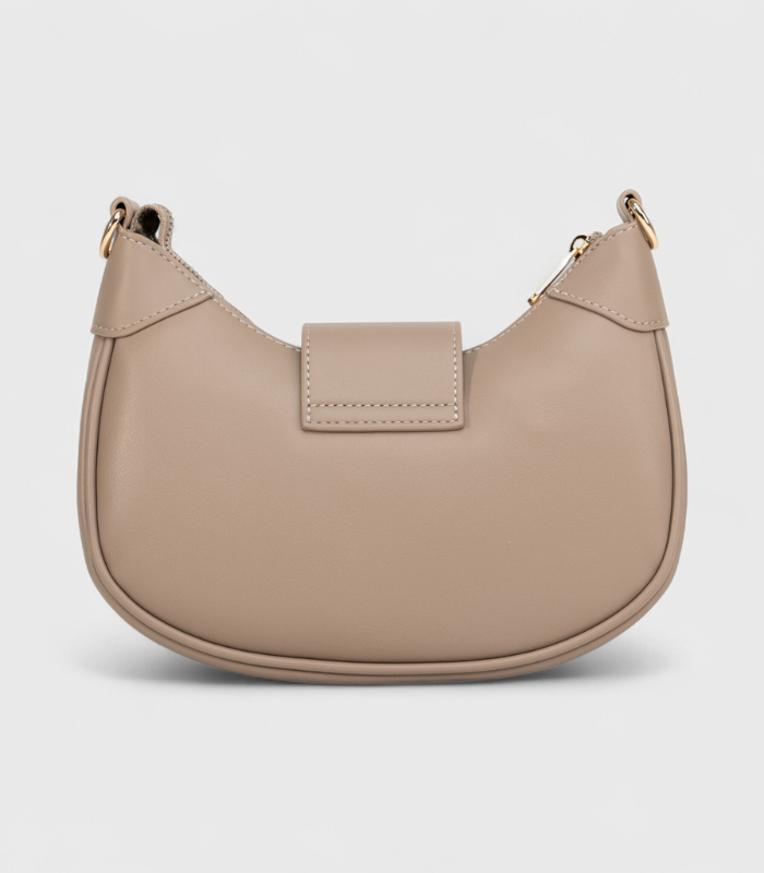 Ova bež torbica baguette stila sinonim je za profinjenost i lakoću kombiniranja. Izrađena od kvalitetne eko-kože, njen zaobljeni oblik pruža elegantnu liniju, dok je praktičnost zajamčena. Svjetlucavi zlatni okovi i prepoznatljiva kopča podižu njen izgled na viši nivo. Savršen dnevni dodatak – nosite je preko ramena i uživajte u bezvremenskom stilu!