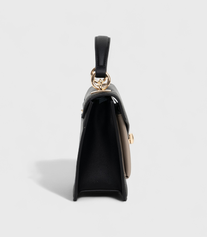 Ova strukturirana torba u crnoj boji stvara upečatljiv vizualni dojam zahvaljujući geometrijskom detalju preklopa izrađenom u neutralnoj bež nijansi. Njen oblik i oštre linije odražavaju minimalizam i profinjenost, dok finiš s teksturom jamči izdržljivost. Diskretna zlatna kopča na sredini torbe služi kao elegantan akcent.