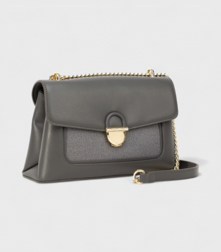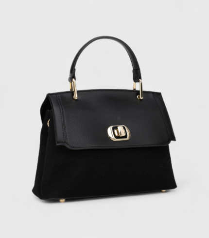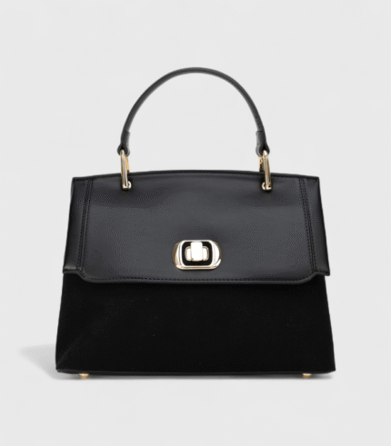 Ova moderna crna torba, oblikovana kao “bucket bag”, predstavlja dinamičan spoj čistih linija i urbanog šika. Izrađena od glatkog materijala s blago zaobljenim dnom, ističe se neobičnim preklapajućim dizajnom sprijeda. Zlatni logotip je upečatljiv, ali najveću pozornost plijeni ukrasna logotip traka koja dodaje moderan naglasak. Njen prostrani interijer i udobna ručka čine je iznimno funkcionalnom za svakodnevne avanture.