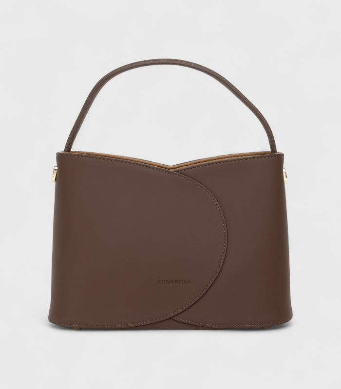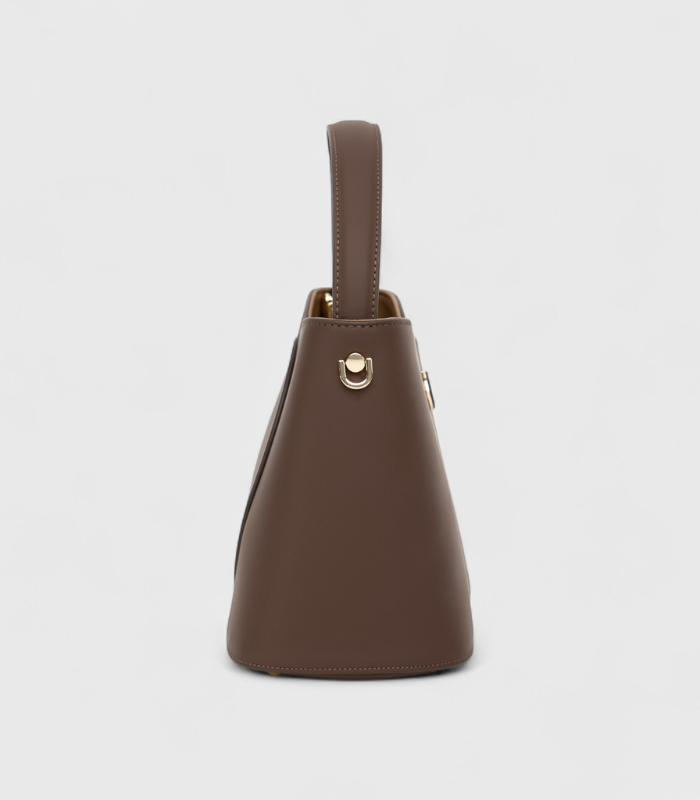 Ova torba plijeni pažnju svojom bogatom, tamno smeđom nijansom, koja predstavlja klasiku luksuza u svijetu mode. Njena inovativna bucket silueta zadržava svoju čvrstu formu, nudeći iznenađujuću prostranost, dok diskretni preklopni dizajn s prednje strane dodaje slojevitu dimenziju. Profinjeni metalni akcenti daju joj sjaj, čineći je savršenom za dame koje cijene stil i izdržljivost.