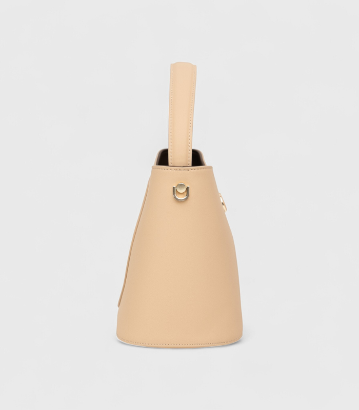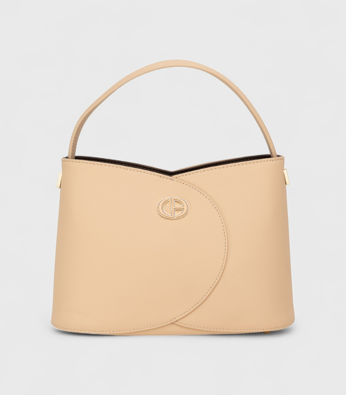 Ova strukturirana torba plijeni pažnju svojom nježnom bež nijansom, koja simbolizira profinjenost. Njezina moderna i čvrsta forma pruža obilje prostora, a diskretni preklapajući detalji daju joj sofisticiranu dimenziju. Blještavi metalni detalj stvara elegantan kontrast bogatoj boji.